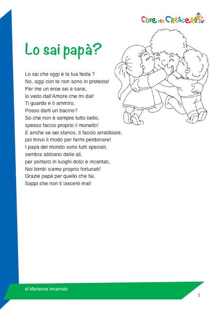 Una filastrocca scritta da Marianna Incarnato da imparare e da dedicare al papà in occasione della Festa del papà il 19 marzo, per il suo compleanno. Lo sai papà è una poesia per bambini adatta sia ai bambini della scuola primaria sia a quelli più piccoli che frequentano la scuola dell’infanzia. La proponiamo da leggere online e in una versione illustrata con un disegno per bambini da colorare e da stampare gratuitamente. Basta scorrere la pagina verso il basso e cliccare sull’immagine dove segnato: si aprirà una seconda finestra con la filastrocca per il papà in formato pdf, da scaricare e/o da stampare direttamente con una normale stampante e su un foglio in formato A4.