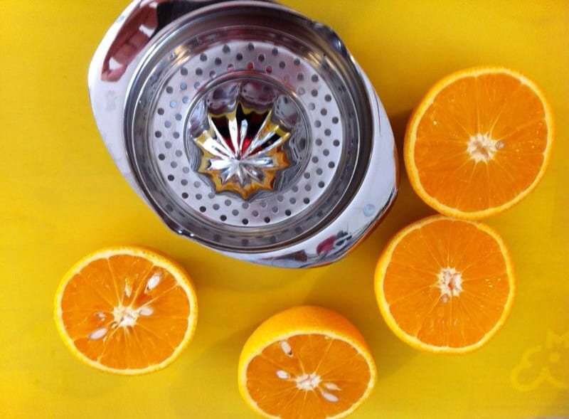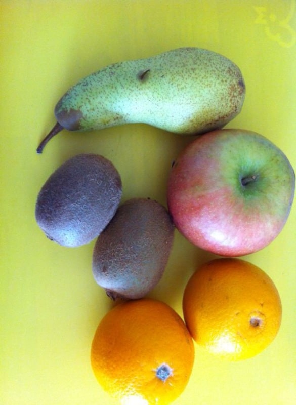 - Lavare e tagliare tutta la frutta a pezzettini, tranne le arance. Tagliare i chicchi d’uva a metà e togliere i semi.