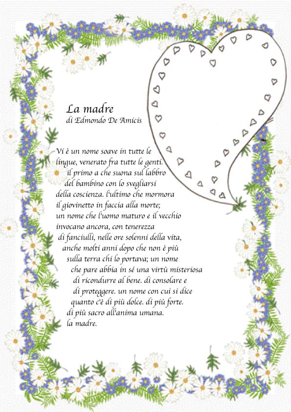 La madre di Edmondo De Amicis Una poesia d’autore da regalare alla mamma per il suo compleanno o per la Festa della Mamma. Una poesia da stampare da colorare e da dedicare alla mamma. I bambini potranno scrivere un pensiero all’interno del cuore da colorare. POESIA DA STAMPARE Cliccare sulla poesia per stamparla: