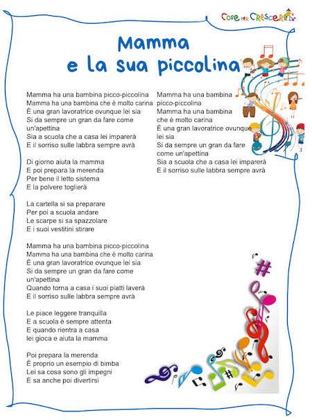 Mamma e la sua piccolina è una canzone e filastrocca per bambini tenera e divertente che racconta di una dolce e bravissima bambina, gioia e orgoglio della sua mamma. Una canzone di Hey Kids, tratta dall’album Canzoni per bambini, che ogni bambina può dedicare alla mamma il giorno della Festa della mamma e di cui proponiamo il video per ascoltarla, il testo da leggere online per cantarla direttamente e, più in basso, il testo da stampare gratuitamente per impararla e cantare tutti insieme! La canzone per la mamma è adatta ai bambini della scuola primaria e a quelli più piccoli della scuola dell’infanzia. Per stampare il testo della canzone Mamma e la sua piccolina, scorri la pagina verso il basso e segui le istruzioni.
