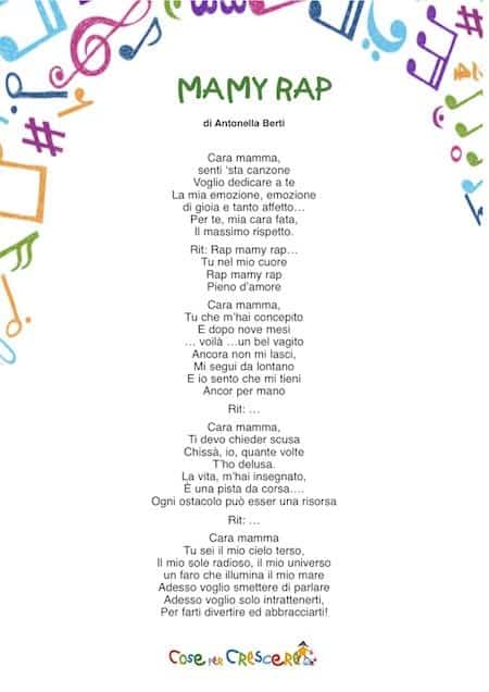 Una canzone piena di ritmo, più esattamente ritmo di rap, da dedicare alla mamma, per il suo compleanno o semplicemente per dirgli quanto gli vogliamo bene. Mamy Rap è una canzone scritta da Antonella Berti di cui proponiamo il testo sia da leggere online che da stampare, per poterla cantare tutti insieme.