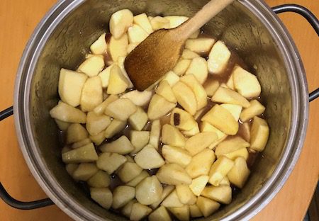- Iniziare la cottura a fuoco medio, mescolando ripetutamente e dopo 30 minuti circa, quando le mele saranno sfatte, schiacciare con una forchetta le mele ormai sfatte nella stessa casseruola.