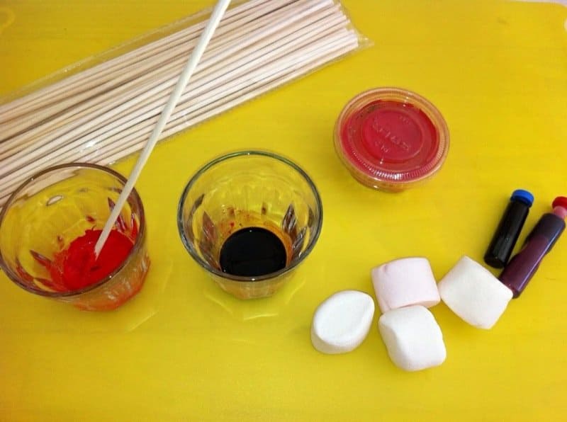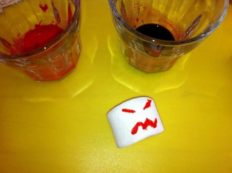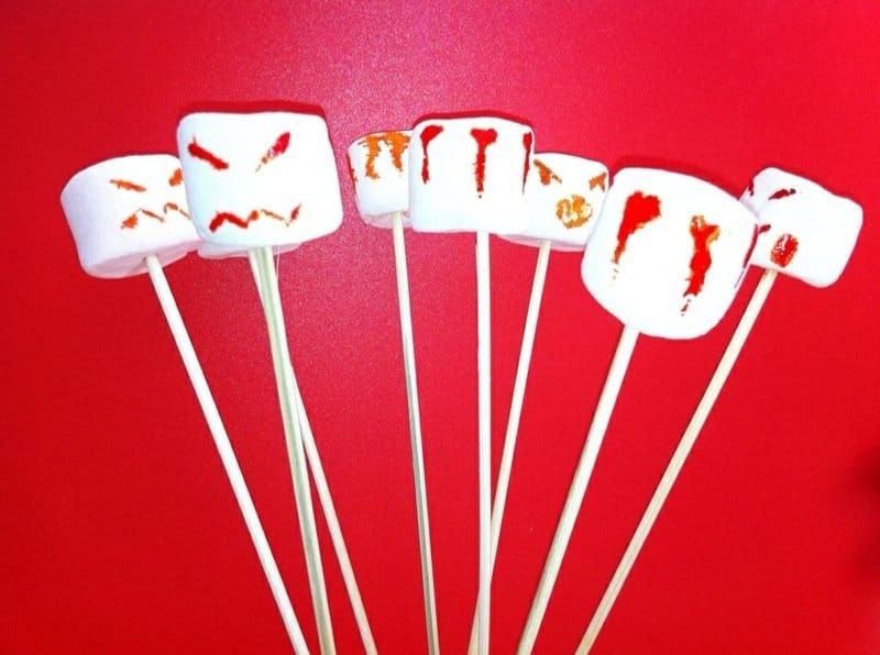 • Con la punta di uno spiedino, disegnare sui marshmallow diverse figure come un fantasma, un mostro o del sangue che cola (berk!).