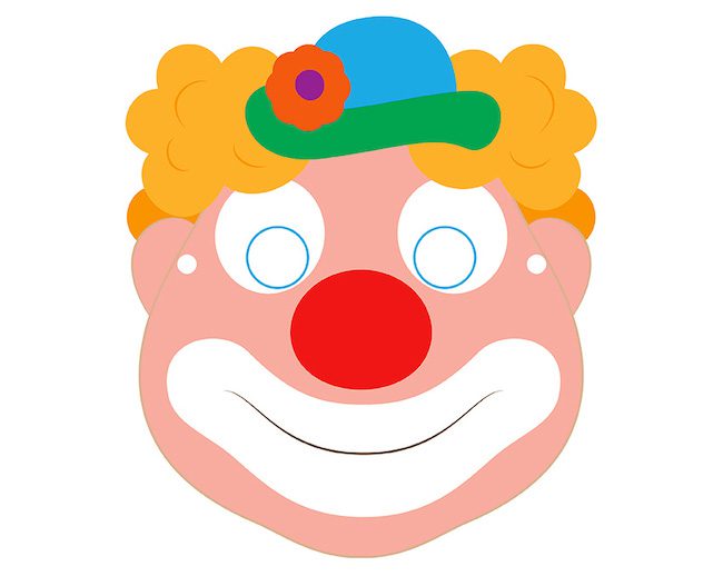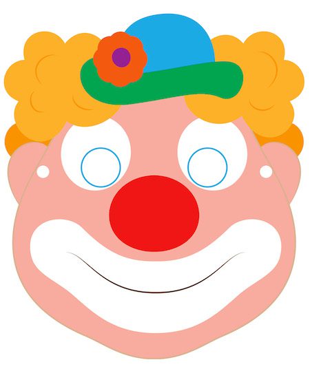 Una maschera da pagliaccio da stampare gratuitamente, da ritagliare e indossare. Una maschera per bambini per travestirsi a Carnevale o da usare per giocare con gli amici o per una recita scolastica. Una maschera che potrà essere utile per completare un vestito da pagliaccio fai da te.