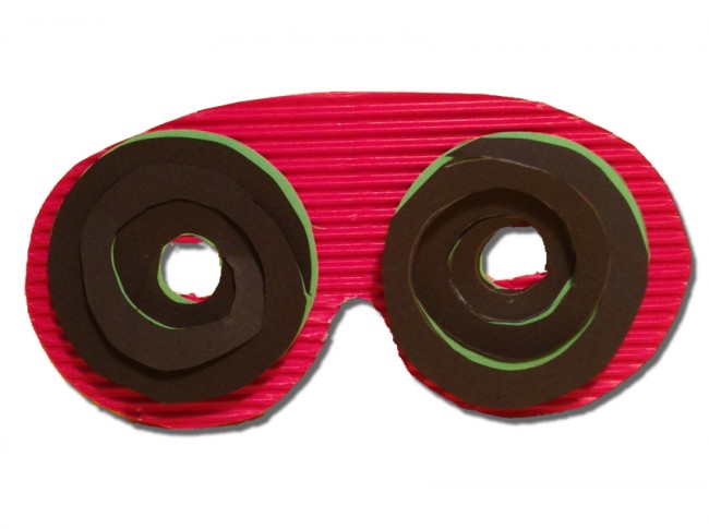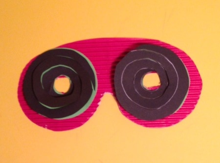 - Incollare le spirali verdi sulla maschera, incollando solo la parte centrale intorno ai buchi per gli occhi.