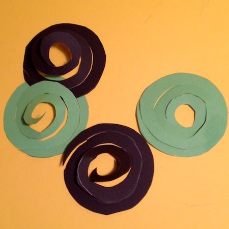 - Ritagliare ogni cerchio di carta lungo la linea della spirale. Arrivando al centro, ritagliare il cerchietto centrale in modo da eliminarlo.