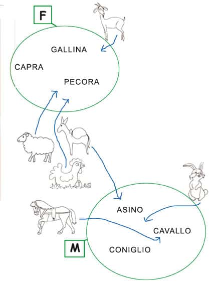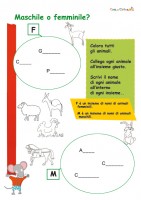 Una scheda per divertirsi con un doppio esercizio: riconoscere ed individuare due insiemi diversi e riconoscere il maschile dal femminile. I bambini dovranno inoltre scrivere il nome di ogni animale, imparandone l’ortografia.