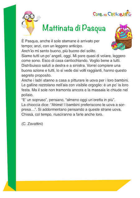 Un dettato sul tema della Pasqua per i bambini che frequentano la scuola primaria. Un testo di C. Zavattini che racconta i tanti volti di una mattina di Pasqua, fino alle galline che forse un giorno faranno delle uova a sorpresa, chissà… Un dettato ortografico con difficoltà miste particolarmente adatto alle classi seconda, terza e quarta elementare, che proponiamo sia da leggere online sia in una versione da stampare gratuitamente, utile da dare ai bambini per una correzione autonoma.