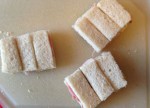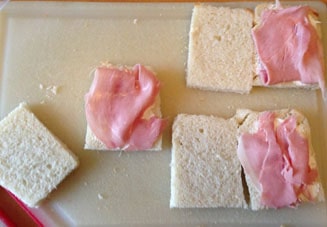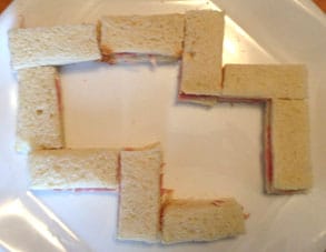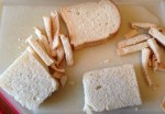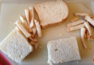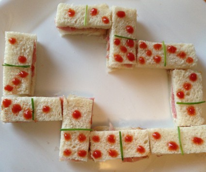 - Dividere ogni rettangolo/panino con un filo di erba cipollina. Utilizzando del ketchup, disegnare i puntini dei numeri delle pedine del domino. Per un lavoro preciso con il ketchup, potete utilizzare una tasca da pasticciere o un bastoncino intriso di ketchup.