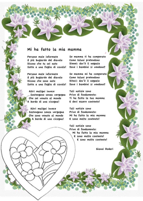 Mi ha fatto la mia mamma. E sono molto contento! Una bella poesia di Gianni Rodari, dal tono scherzoso e molto dolce. Una poesia da stampare, colorare e regalare alla mamma.
