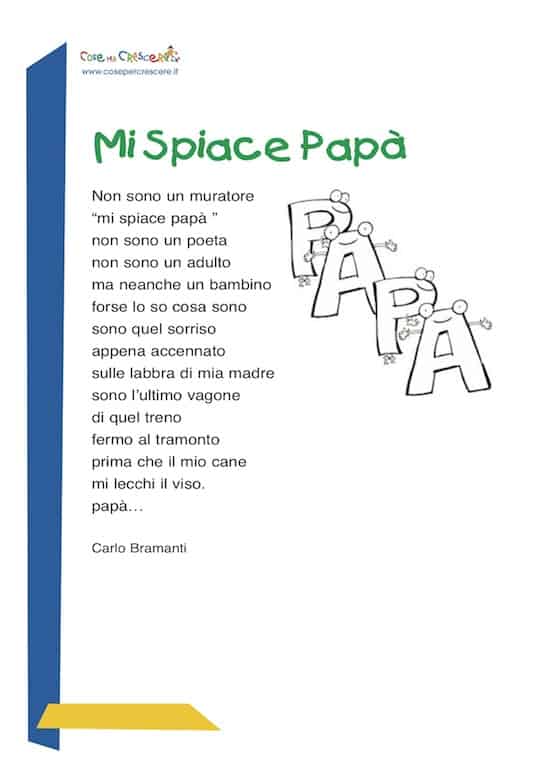 Poesia per il papàUna poesia piena di dolcezza da dedicare al papà. Una poesia per bambini scritta da Carlo Bramanti e da stampare gratuitamente.
