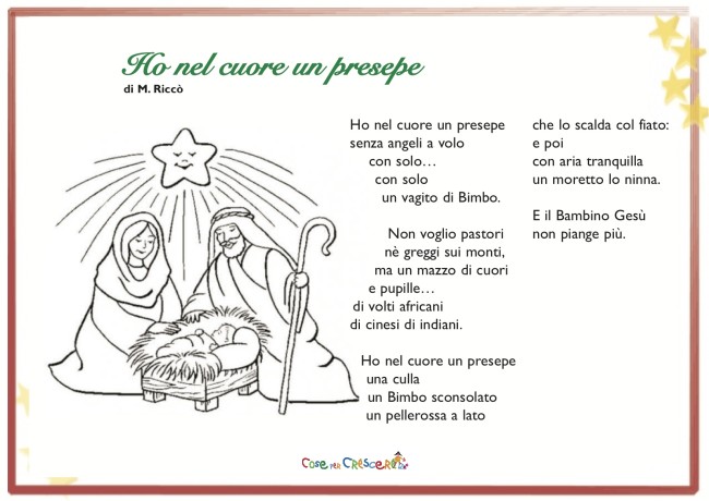 Una poesia di Natale per bambini, di M. Riccò che ci racconta di un presepe particolare, senza pastori, senza angeli in volo ma volti africani, cinesi e indiani.