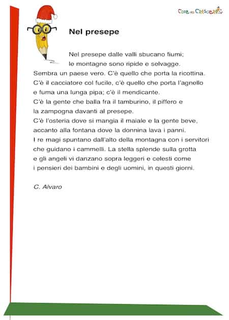 Nel presepe dalle valli sbucano fiumi; le montagne sono ripide e selvagge. Sembra un paese vero. C’è quello che porta la ricottina. C’è il cacciatore col fucile, c’è quello che porta l’agnello e fuma una lunga pipa; c’è il mendicante. C’è la gente che balla fra il tamburino, il piffero e la zampogna davanti al presepe. C’è l’osteria dove si mangia il maiale e la gente beve, accanto alla fontana dove la donnina lava i panni. I re magi spuntano dall’alto della montagna con i servitori che guidano i cammelli. La stella splende sulla grotta e gli angeli vi danzano sopra leggeri e celesti come i pensieri dei bambini e degli uomini, in questi giorni.