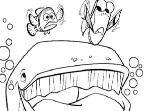Un disegno del pesciolino Nemo e della balenottera azzurra, tutti e due sorridenti, da stampare gratis e da colorare. Un disegno tratto dal film d’animazione “Alla ricerca di Nemo”. La balenottera azzurra è la balena che Marlin e Dory incontrano dopo essere usciti dalla C.O.A. Inizialmente sembra che li voglia mangiare, in quanto li aspira nella sua bocca, ma invece li trasporterà a Sydney espellendoli poi dallo sfiatatoio.