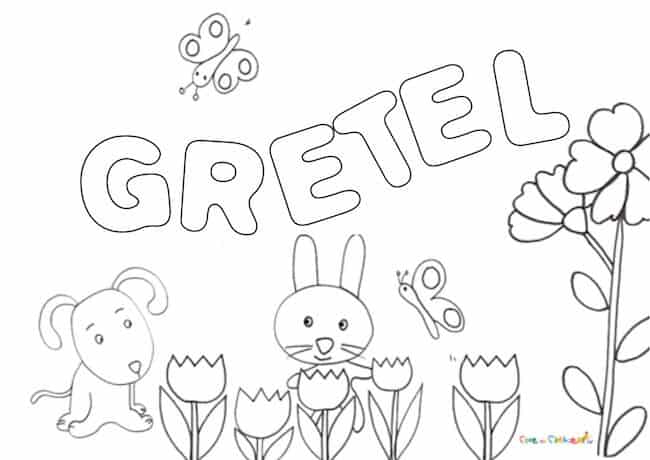 Il disegno del nome Gretel da stampare gratuitamente e da colorare. Per divertirsi e imparare i caratteri che compongono il proprio nome!
