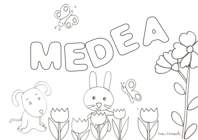 Disegno del nome MEDEA pronto da stampare e da dare alla vostra bimba da colorare, per divertirsi con il proprio nome ed impararne i caratteri.