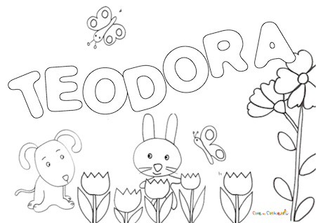 Disegno del nome TEODORA pronto da stampare e da dare alla vostra bimba da colorare, per divertirsi con il proprio nome ed impararne i caratteri.