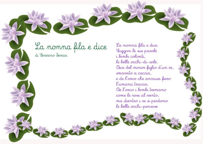 La nonna fila e dice Una poesia per la nonna di Severino Ferrari. Una dolce poesia da regalare alla nonna, arrotolata e chiusa con un bel fiocco colorato. I bambini potranno scrivere una piccola dedica personale o fare un bel disegno della nonna nello spazio bianco. POESIA DA STAMPARE Cliccare sulla poesia per stamparla: