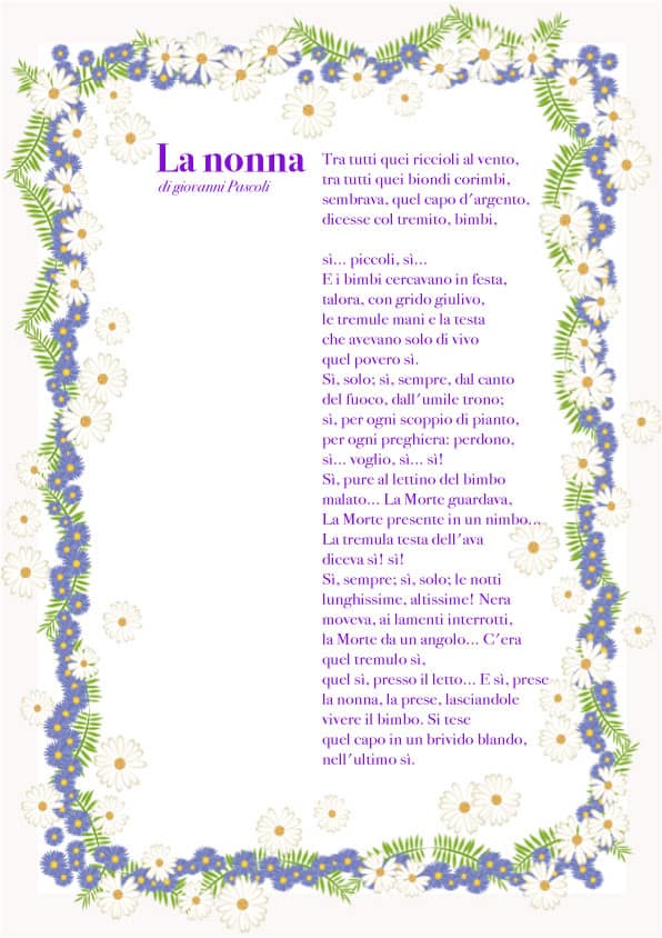 La nonna: di Giovanni Pascoli Una poesia in cornice, da stampare e da regalare alla nonna. Una poesia scritta da Giovanni pascoli, adatta ai bambini più grandicelli. POESIA DA STAMPARE Cliccare sulla poesia per stamparla: