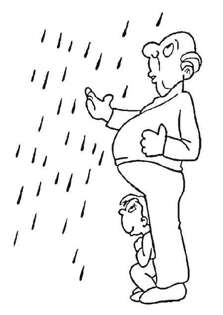 Un divertente e tenerissimo disegno da colorare e da regalare al nonno il giorno della Festa dei nonni o in qualsiasi altra occasione. In questo disegno, un nonno protegge dalla pioggia il suo nipotino, mettendolo al riparo sotto… la sua pancia! Un disegno da colorare, adatto ai bambini che frequentano la scuola primaria e la scuola dell’infanzia e che, come tutti i disegni per bambini che proponiamo, è da stampare gratuitamente. Per stampare il disegno di Nonno e nipote da colorare, scorri la pagina verso il basso e segui le istruzioni. Si aprirĂ poi una pagina con il disegno in formato pdf, pronto per essere scaricato e/o direttamente stampato!