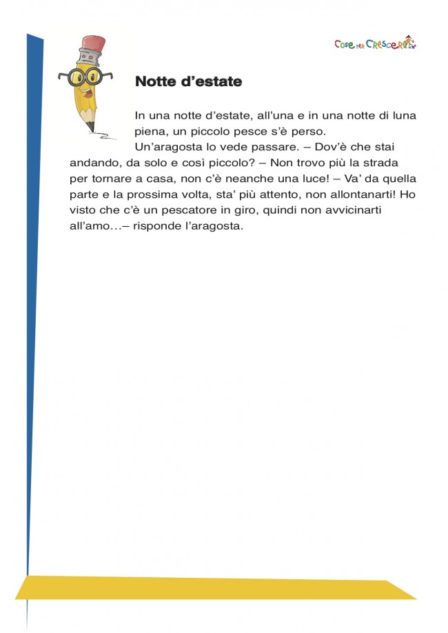 In una notte d’estate, all’una e in una notte di luna piena, un piccolo pesce s’è perso. Un’aragosta lo vede passare. – Dov’è che stai andando, da solo e così piccolo? – Non trovo più la strada per tornare a casa, non c’è neanche una luce! – Va’ da quella parte e la prossima volta, sta’ più attento, non allontanarti! Ho visto che c’è un pescatore in giro, quindi non avvicinarti all’amo…– risponde l’aragosta.