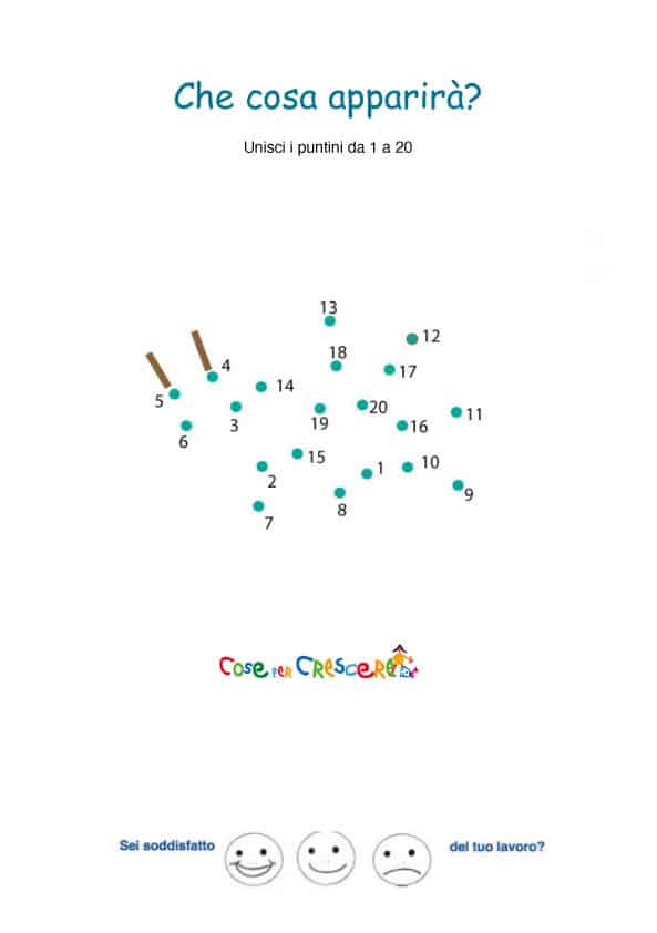 Da 1 a 20: che cosa apparirà? Una pista cifrata per i più piccoli, per esercitarsi a numerare da 1 a 20… Da stampare e disegnare per scoprire che cosa apparirà… GIOCO DA STAMPARE Cliccare sul disegno per stamparlo: >>>Per vedere la soluzione, clicca qui!