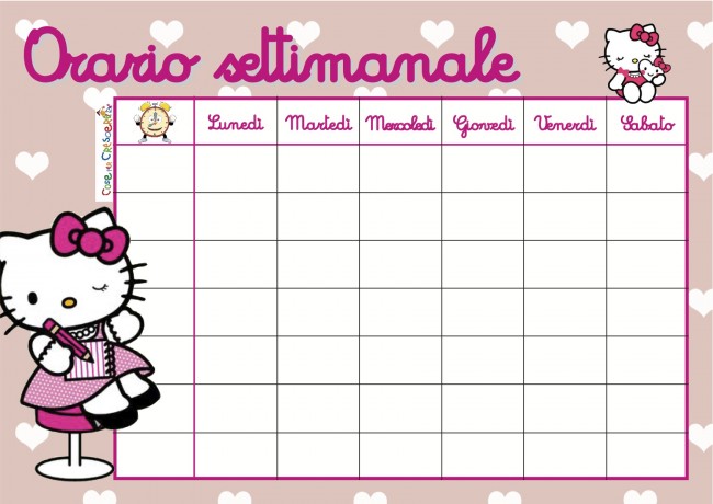 Una tabella dell’orario settimanale che piacerà molto alle bambine, l’orario di Hello Kitty! Da stampare gratuitamente e compilare per tenere sotto controllo materie scolastiche e attività extra-scolastiche.