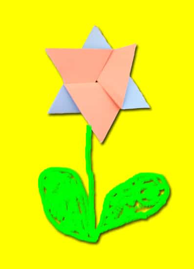 - Questo origami è un lavoretto di piegatura di origami tradizionale, incollato su un biglietto di cartoncino colorato. Il fiore in origami è un modo originale per inviare messaggi alle persone care. Per realizzare questo lavoretto, aiutate il bambino a ritagliare un triangolo equilaterale e cogliete l’occasione per mostrargli le diverse forme dei triangoli, ripassandone i nomi con insieme.