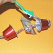 - Infilare, come nell’immagine, una capsula nello scovolino da pipa, seguita dal quadrato argentato e dalla seconda capsula capovolta. Ripiegare una delle estremità dello scovolino, in modo da fare una pallina. Incollare le basi delle capsule sul cartoncino quadrato.