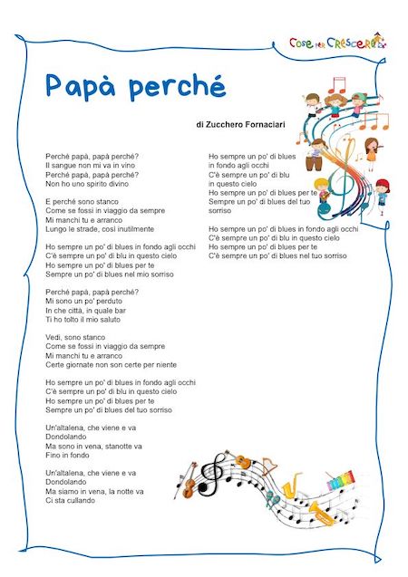 Questa canzone, scritta da Zucchero Fornaciari nel 1995, parla del tempo che passa e che è andato e dell’importanza della figura paterna. Una canzone che il cantautore emiliano dedica a suo padre scomparso. Proponiamo la canzone Papà perché sia da ascoltare con un video tratto da Youtube, sia da imparare leggendo il testo online o stampandolo. Per stampare il testo della canzone basta scorrere la pagine verso il basso e cliccare dove segnato: si aprirà una seconda finestra con il testo di Papà perché in formato pdf pronto per essere scaricato e/o direttamente stampato con una normale stampante. Un brano da ascoltare, cantare e dedicare al papà il 19 marzo, giorno in cui si celebra la Festa del papà!