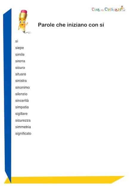 Un elenco di parole che iniziano con si in lingua italiana, da leggere per controllarne l’ortografia o da imparare per arricchire il proprio vocabolario. Un elenco di parole che può anche essere utile per un dettato a scuola o per proporre ai bambini un esercizio di “trova le parole” (che può facilmente essere impostato come gioco per bambini), utile per verificare le loro conoscenze. In fondo alla pagina, abbiamo preparato un elenco di parole che iniziano con si adatte ai bambini che frequentano la scuola primaria e che potrete stampare facilmente. Un elenco di parole che potrà essere usato come dettato (e da dare ai bambini perché possano fare un’auto-correzione) o semplicemente da leggere con i bambini.