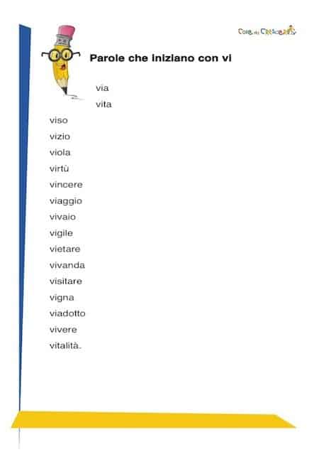 Un elenco di parole che iniziano con vi in lingua italiana, da leggere per controllarne l’ortografia o da imparare per arricchire il proprio vocabolario. Un elenco di parole che può anche essere utile per un dettato a scuola o per proporre un esercizio di “trova le parole” (che può essere impostato come gioco per bambini), utile per verificare le loro conoscenze. In fondo alla pagina, abbiamo preparato un elenco di parole che iniziano con vi adatte ai bambini che frequentano la scuola primaria e che potrete stampare facilmente. Un elenco di parole che potrà essere usato come dettato (e da dare ai bambini perché possano fare un’auto-correzione) o semplicemente da leggere con i bambini.
