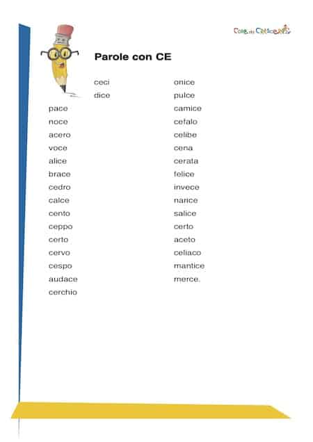 Tante parole con CE, che contengono o iniziano con la particella CE. Un elenco di parole da usare per trovare idee o verificarne l’ortografia quando si gioca a Scarabeo, quando si risolve un cruciverba o per altri giochi. Questo elenco di parole può anche essere dettato ai bambini per verificare le loro competenze ortografiche o per gli esercizi di divisioni in sillabe.