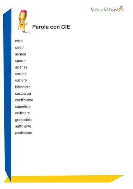 Un elenco di parole che iniziano con CIE in lingua italiana, da leggere per controllarne l’ortografia o da imparare per arricchire il proprio vocabolario. Per imparare a scriverle senza doverne controllare l’ortografia, per un dettato a scuola o per proporre ai bambini un esercizio di “trova le parole” (che può facilmente essere impostato come gioco per bambini), utile per verificare le loro conoscenze. In fondo alla pagina, abbiamo preparato un elenco di parole che iniziano con CIE adatte ai bambini che frequentano la scuola primaria e che potrete stampare facilmente. Un elenco di parole che potrà essere usato come dettato (e da dare ai bambini perché possano fare un’auto-correzione) o semplicemente da leggere con i bambini.