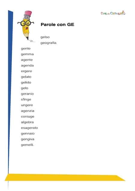 Un elenco di parole che contengono o iniziano con la particella GE. Parole da leggere insieme per verificarne l’ortografia, da usare nei giochi legati alle parole o da dettare ai bambini per aiutarli a esercitarsi.