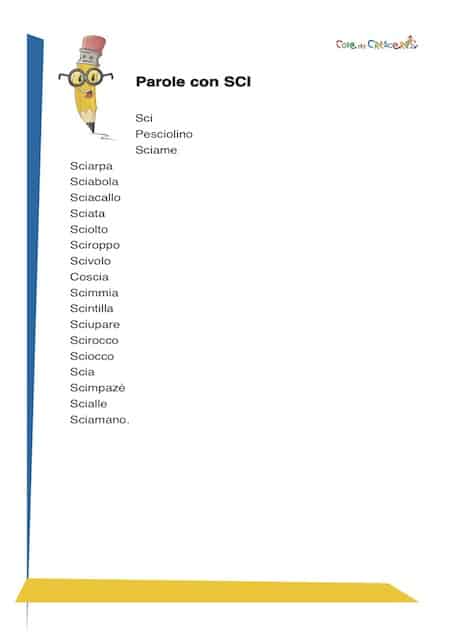 Sci, pesciolino, sciame, sciarpa, sciabola, sciacallo, sciata, sciolto, sciroppo, scivolo, coscia, scimmia, scintilla, sciupare, scirocco, sciocco, scia, scimpazé, scialle, sciamano.