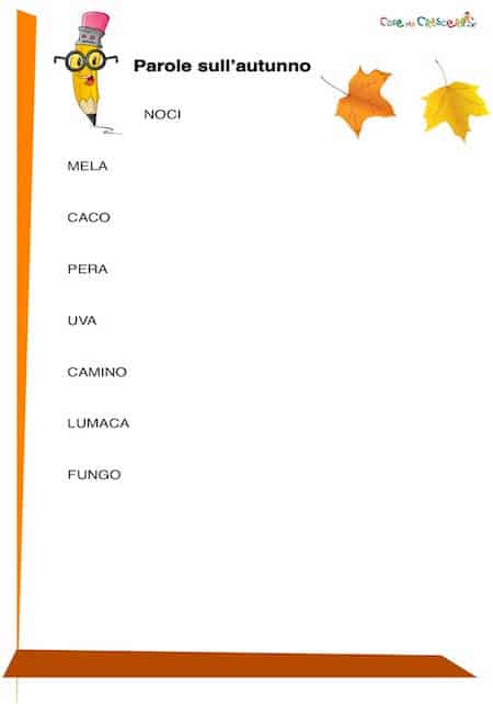 In questa pagina trovi un elenco di parole sull’autunno pensato per essere usato come dettato o come base per altre attività di lettura e scrittura. È adatto ai bambini che frequentano la prima elementare, in una fase in cui stanno imparando a scrivere in modo autonomo e corretto.