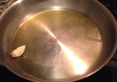 - In una grande padella, fate imbiondire lo spicchio d’aglio nell’olio. Toglietelo appena sarà dorato, senza farlo bruciare.
