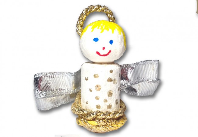 - Formare un anello con un pezzo di filo trasparente (servirà per appenderlo) e incollarlo dietro alla testa, sotto l’aureola. L’angelo di Natale è pronto!