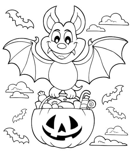 Un simpatico pipistrello di Halloween da colorare: un disegno da colorare adatto ai bambini più piccoli perché con campi da colorare chiari e ben definiti. In questo disegno, un pipistrello felice e sorridente con le ali spiegate tiene una zucca piena di dolcetti e caramelle tra le sue zampette. Come tutti i nostri disegni, anche questo disegno da colorare per Halloween è da scaricare e da stampare gratuitamente. Come fare? Basta scorrere la pagina verso il basso e cliccare sul disegno del pipistrello dove segnato: si aprirà una seconda finestra con il disegno per bambini in formato A4 e in pdf, pronto per essere scaricato e/o stampato con una normale stampante.