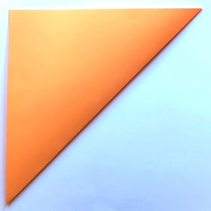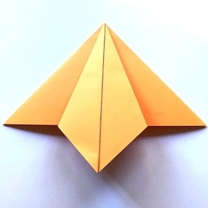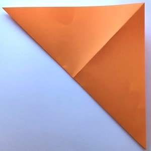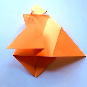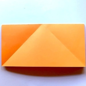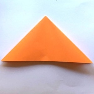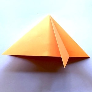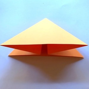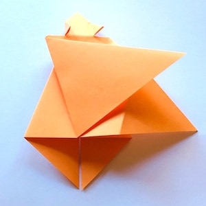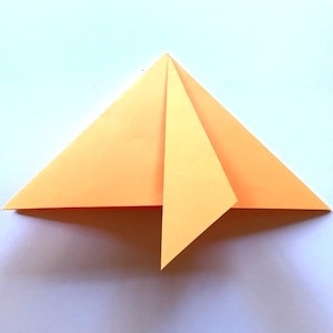 • Capovolgere il lavoro e piegare il triangolo destro a metà, portandone il vertice verso la base superiore opposta (sotto la testa).