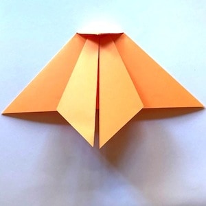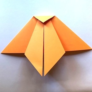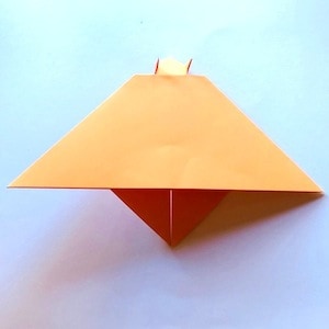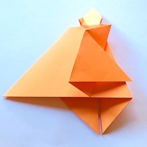 • Piegare il vertice superiore verso il basso, formando un triangolo più piccolo che sarà la testa. Segnare bene la piega.