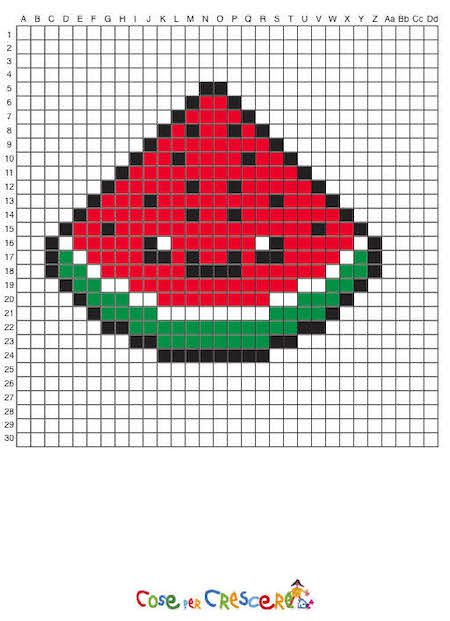 Inoltre, la pixel art anguria kawaii è perfetta per avvicinare i bambini al mondo del coding unplugged, grazie all’uso della griglia e alla logica necessaria per la riproduzione del disegno.