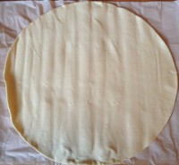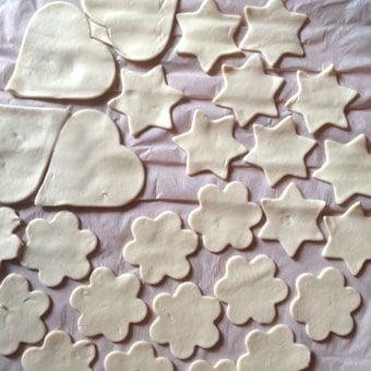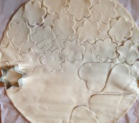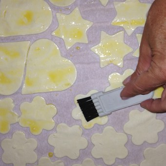- Stendete la pasta sfoglia su un foglio di carta da forno e, con le formine, ritagliate più basi di pizzette possibili. Togliete la pasta in eccedenza. Per non sprecare la pasta sfoglia recuperata, lavoratela leggermente con le mani, stendetela con un matterello su un piano di lavoro infarinato e ritagliate altre basi di pizzette.