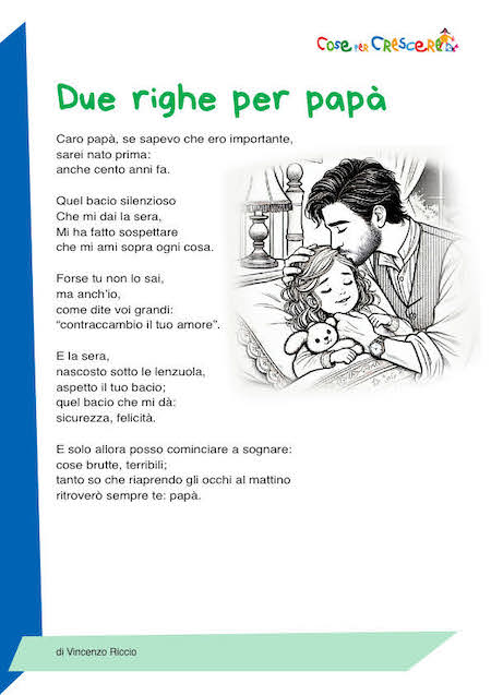 La Festa del Papà è un’occasione speciale per dimostrare affetto e gratitudine al proprio babbo. E quale miglior modo di farlo se non con una dolce poesia? Oggi ti presentiamo “Due righe per papà” di Vincenzo Riccio, una poesia pensata proprio per i bambini che vogliono dedicare parole speciali al loro papà. Una poesia per bambini adatta ai bambini che frequentano la scuola primaria. Ti proponiamo la poesia sia da leggere online sia in una versione illustrata con un disegno da colorare e da stampare gratuitamente.