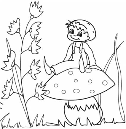 Pollicino seduto sul fungo: da colorare Disegno del piccolo Pollicino seduto su un grande fungo, da stampare e colorare, per divertirsi e sognare con la storia di questo piccolissimo e simpatico bambino. Cliccare sul disegno per stamparlo: