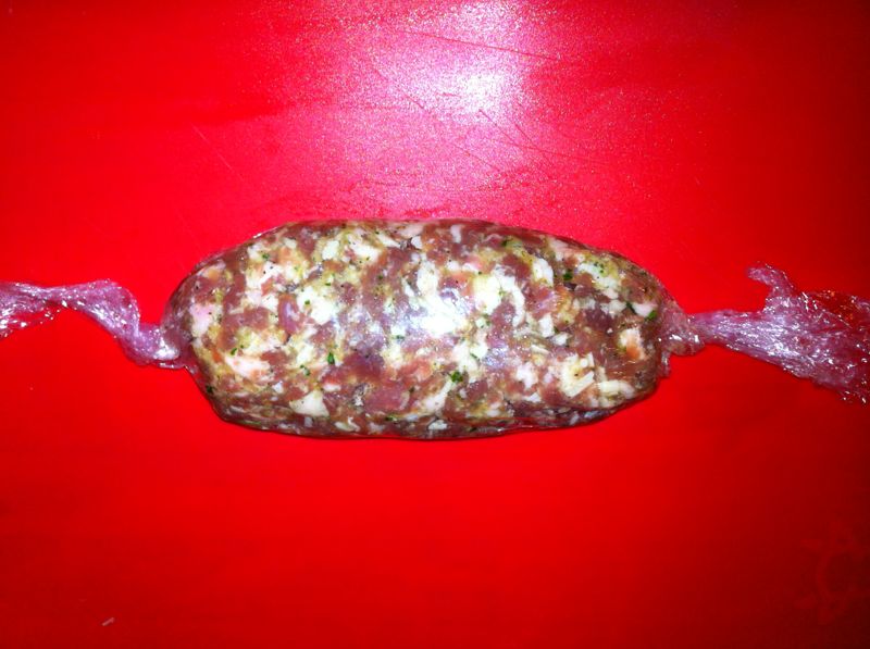 - Mettere un foglio di pellicola trasparente per alimenti. Riporre il ripieno al centro della pellicola. Chiudere la pellicola e dare la forma desiderata al polpettone.