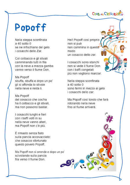 La canzone racconta in maniera ironica la storia di un immaginario cosacco Popoff, il quale, essendo grasso e goffo, non riesce a marciare nella neve insieme agli altri cosacchi verso il fiume Don ma poi raggiunge e supera tutti i suoi compagni prima scivolando nella neve sulla sua grossa pancia e poi rotolando nella neve come una grossa palla. Una canzone adatta sia ai bambini della scuola primaria che ai bimbi più piccoli che frequentano la scuola dell’infanzia.
