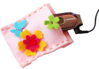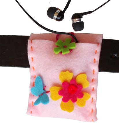 - Intrecciare del filo di cotone per fare un piccolo manico. Si può anche usare una piccola striscia di pannolenci. Cucire il manico su ambedue i lati del porta mp3.