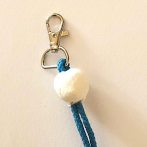 - Capovolgi il lavoretto (la pallina deve essere in basso), prendi la corda di sinistra e falla passare sotto al lavoretto (come nell’immagine.